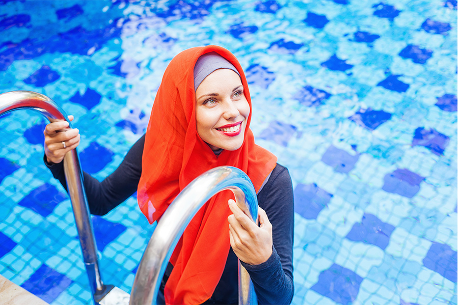 I saw a woman withba bathing suit underneath a long sleeved, long dress and head scarf at a pool where I was staying. Shevhad 3 little girls in the pool and we got to talking. Her husband was okder tgan she was and it was HOT out. He had sandles, shorts and a short sleeved shirt. The woman told me how she loved to swim as a child. Whenever he would circle by, we would have to pretend that we weren't talking. If she had to save any one of her girls, particularly the littlest one, she could drown along with the baby or other kids. I woyld hav we had to do the honors as I have done too many times in my life. I had a one piece sarong style suit. It was modest. There's no reason why they have to wear this ridiculous balony anywhere. Modesty is taught from the beginning. All of those girls had one piece bathing suits on. The only one with bright colors was the baby. That man was a jerk. He didn't want his wife conversing with anybody and in America, she has that right. Her husband was jealous and God oe Allah help her when she went inside. He sure as hell wouldn't jump into rhe pool to save one of his kids. These dresses are dangerous. You can be modest in a swim dress or a one piece. All of that extra gear weights you down. I have saved enough kuds in my life as well as a few adults. The men need to stop being so damned jealous. That is the root of the problem. It has nothing to do with so called modesty.