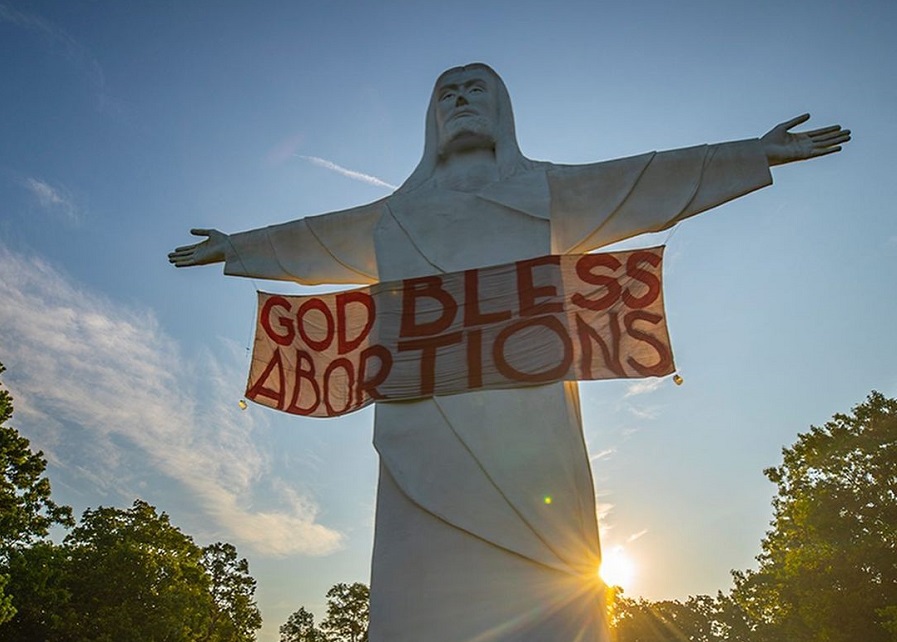 The owners of Arkansas’s largest statue of Jesus woke up one recent morning to a shocking surprise: a 44-foot banner reading “God Bless Abortions” had been hung across it, from arm to arm.