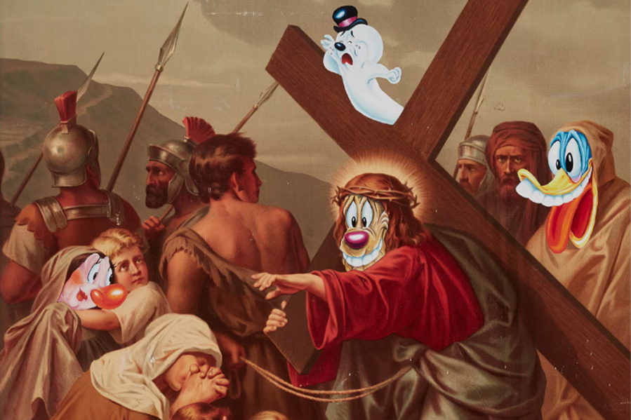 "Jesus Speaks to the Daughters of Jerusalem" is the work of Sydney-based artist Philjames. The 2023 oil-on-lithograph piece depicts Jesus Christ carrying the cross, his face overlaid with a Looney Tunes character.