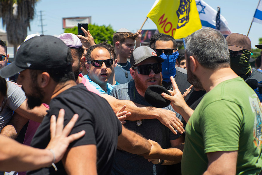 Pro-Palestinian and pro-Israel groups clashed outside a Los Angeles synagogue on Sunday after a protest devolved into violence between the two on the streets outside the place of worship.