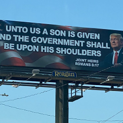 “Unto us a son is given and the government shall be upon his shoulders” read the billboard, next to an image of a beaming Trump. It is attributed to Romans 8:17.