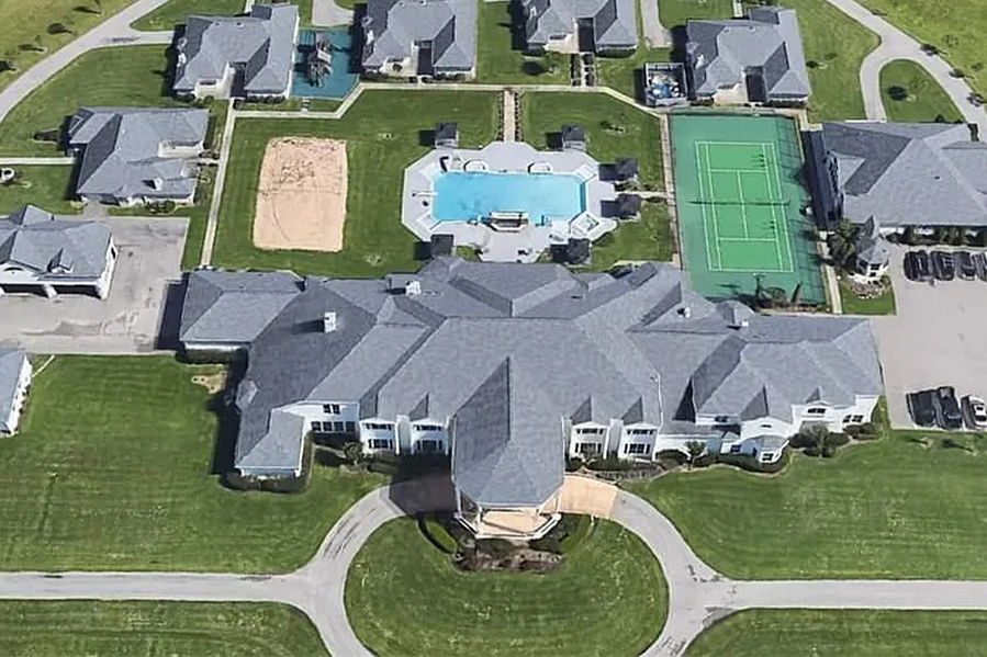 Recently renovated in 2020, the mansion complex boasts a breathtaking foyer, granite finishes, a master bedroom with a 20-foot ceiling, five commercial kitchens, a banquet hall, a 22-car garage, and dozens of bedrooms and bathrooms.