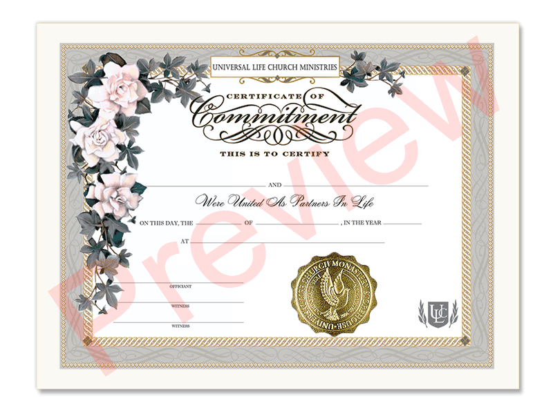 Preside over the upholding and affirmation of the commitment between two partners with this beautiful Certificate of Commitment of Marriage complete with the church seal. This is the perfect certificate to present to a couple that is not comfortable becoming legally wed, but wants a commemorable token of their love.