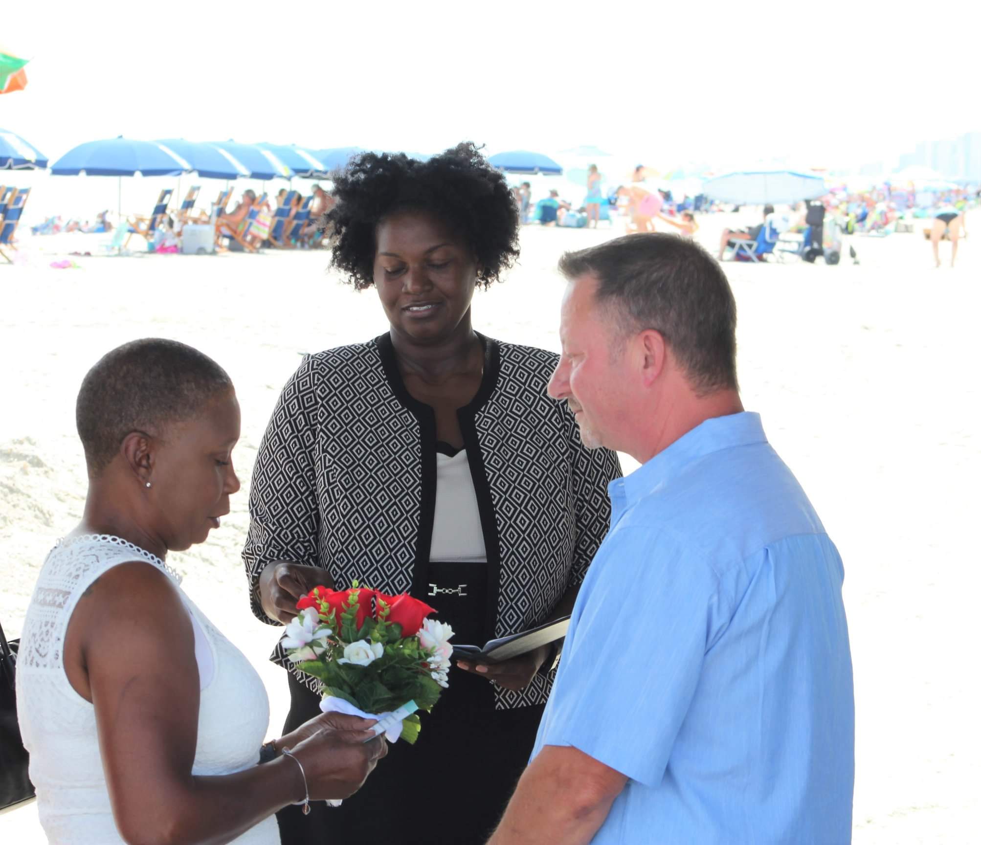 Rev. Tameka Baptiste - North Myrtle Beach, South Carolina, US Posted on 2021-08-03 by Universal Life Church Monastery Officiant: Rev. Tameka Baptiste Wedding Location: North Myrtle Beach, South Carolina, United States - Prince Resort Ordained: 2013-07-15 Contact: Tameka Baptiste We did it! Happy Couple and family. Beach Ceremony Exchanging rings.